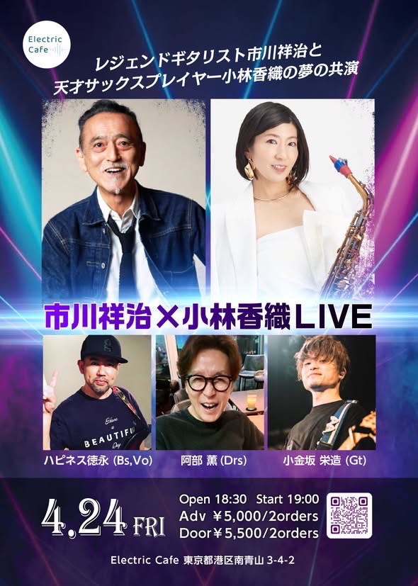市川祥治×小林香織LIVENEW 日程2026年4月24日(金)時間Open 18:30 / Start 19:00開催地東京都会場青山 Electric Cafe料金前売 ¥5,000+2orders 当日 ¥5,500+2ordersチケット3/12 昼12:00~予約受付開始 https://www.ele-cafe.jp/events/8832出演者市川 祥治 (Gt) 小林 香織 (Sax) 小金坂 栄造 (Gt) ハピネス徳永 (Bs,Vo) 阿部 薫 (Drs)